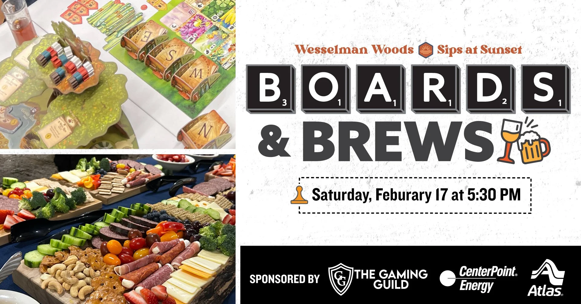 Sips at Sunset: Boards & Brews at Wesselman Woods features nature-based board games and charcuterie boards, paired with a selection of beer and wine. Come out to play and learn something new about nature. Guests also have the chance to win one of our door prizes.