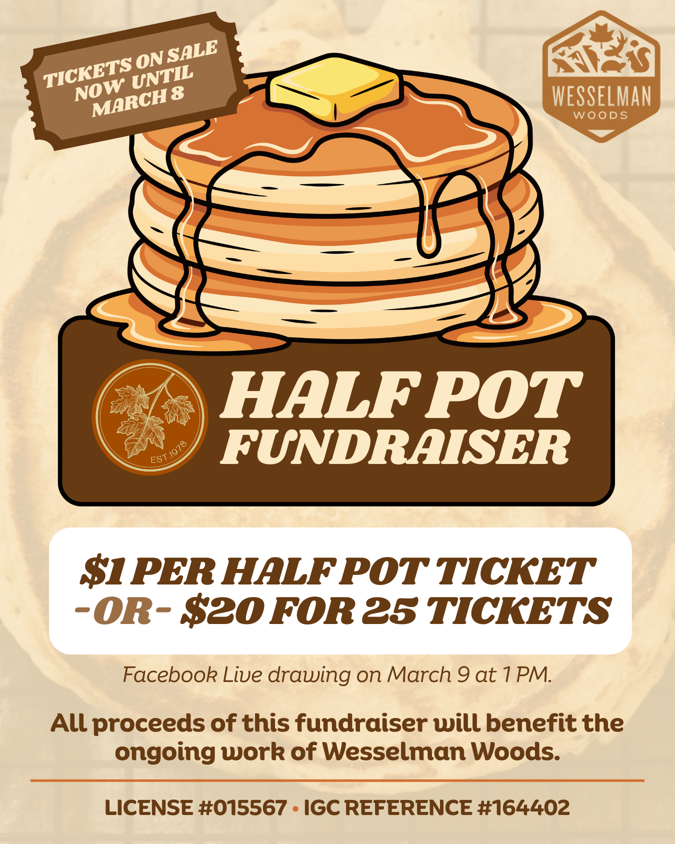 Sap, Syrup… and a Sweet Chance to Win! We’re adding an extra dash of excitement to the annual Maple Sugarbush Festival with a half pot fundraiser! Half the pot supports Wesselman Woods and our ongoing conservation and education work and the other half goes to one lucky winner.