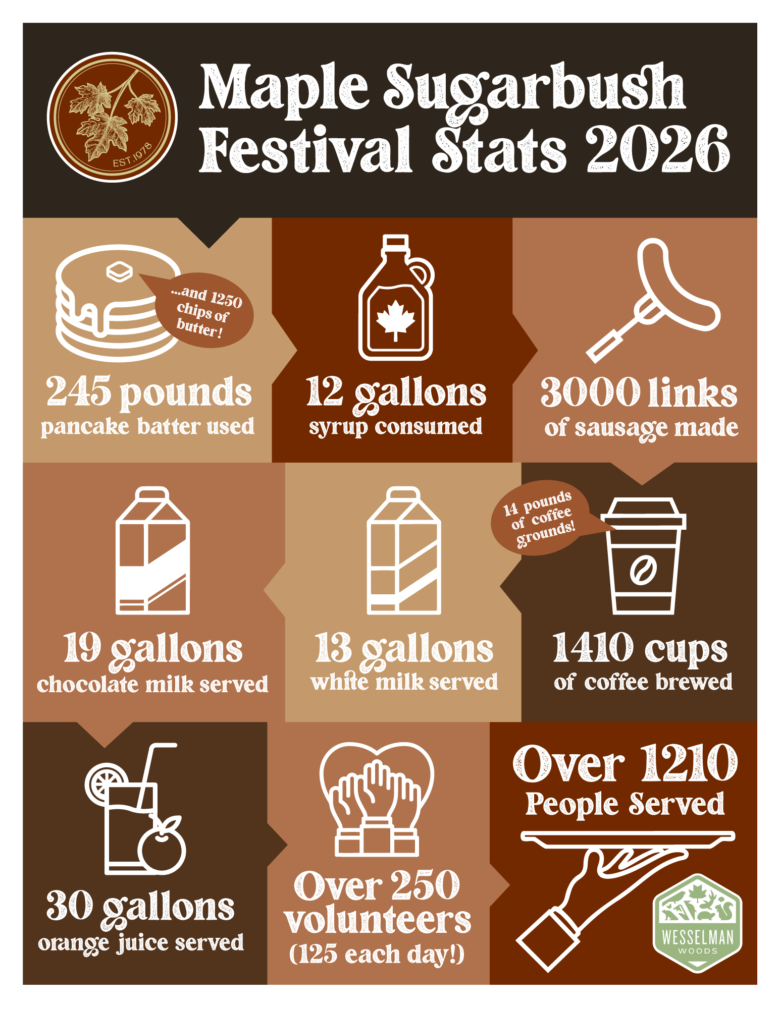 Every year Wesselman Woods hosts a community favorite event: Maple Sugarbush! But what is a maple sugar bush? A maple sugar bush is a forest area where maple trees are tapped for their sugary sap. In early spring, we tap our sugar maple trees at Wesselman Woods to collect sap. All the sap we collect is then poured into an evaporator and boiled into delicious maple syrup. *All trees tapped are outside preserve limits. We tap somewhere between 15 - 25 trees, depending on the year, viability of the tree, and size of the tree.